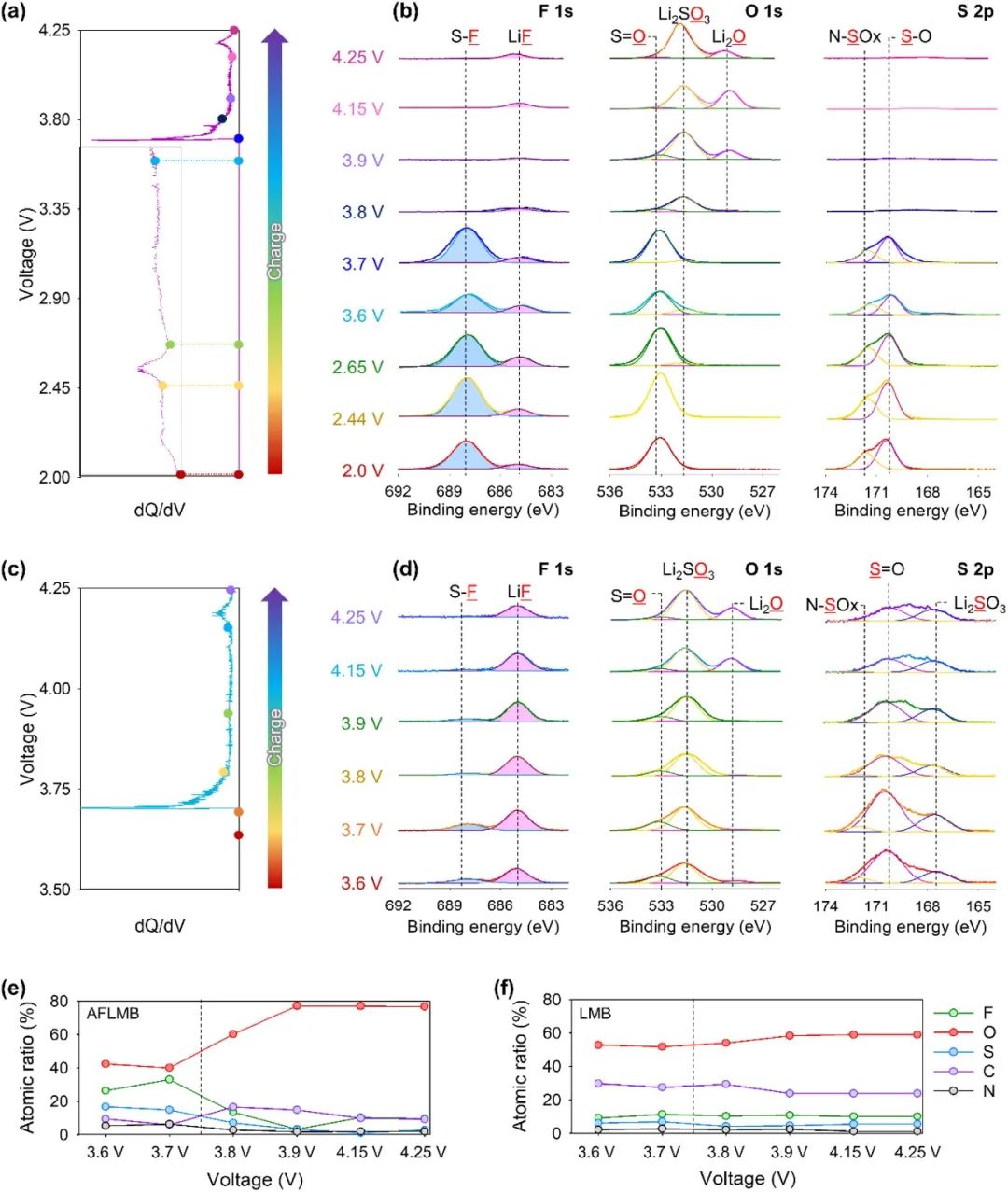 圖4. (a) C/10 預(yù)循環(huán)充電期間 AFLMB 的 dQ/dV 圖。插圖表示與 SEI 形成相對(duì)應(yīng)的 dQ/dV 峰放大區(qū)域。(b) AFLMB 中的銅箔在不同帶電狀態(tài)下的 F 1s、O 1s 和 S 2p XPS 結(jié)果。(c) C/10 預(yù)循環(huán)充電期間 LMB 的 dQ/dV 曲線。(d) LMB 中的鋰金屬陽極在不同充電狀態(tài)下的 F 1s、O 1s 和 S 2p XPS 結(jié)果。XPS 分析得出的 (e) 從 AFLMB 中提取的銅箔和 (f) 從 LMB 中提取的鋰金屬陽極在不同帶電狀態(tài)下的界面層原子比。