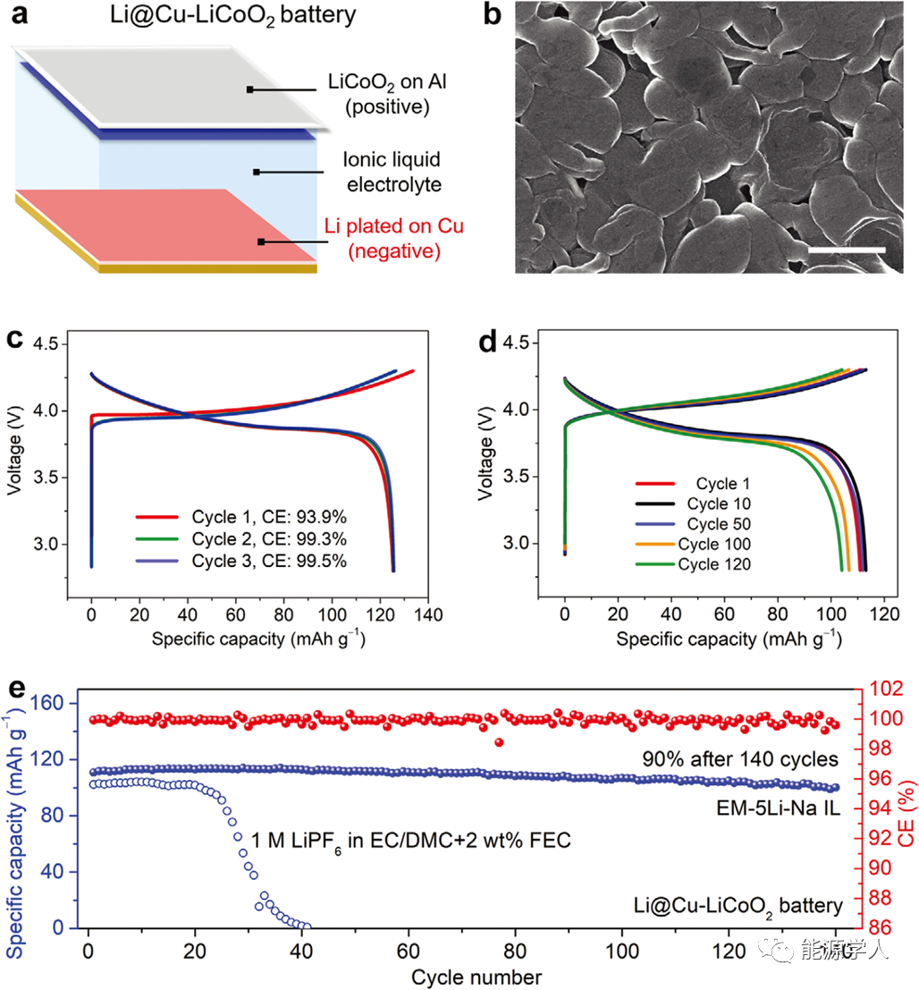圖4 采用EM-5Li-Na IL電解液的Li@Cu-LiCoO2電池。a) Li@Cu-LiCoO2電池結構示意圖,電池負極為沉積了一定量Li金屬的Cu箔。b)Cu表面沉積Li后(面容量:2 mAh cm?2)的表面形貌,比例尺:5 μm。c)采用 EM-5Li-Na IL電解液的Li@Cu - LiCoO2電池在0.25 C下的恒流充放電曲線。d) 采用 EM-5Li-Na IL電解液的Li@Cu-LiCoO2電池在0.7 C下的恒流充放電曲線。e)使用有機電解液和EM-5Li-Na IL電解液的Li@Cu -LiCoO2電池在0.7C下的循環穩定性曲線。(c-e)中LiCoO2的載量為≈10 mg cm?2,所沉積Li金屬的容量約2倍過量。