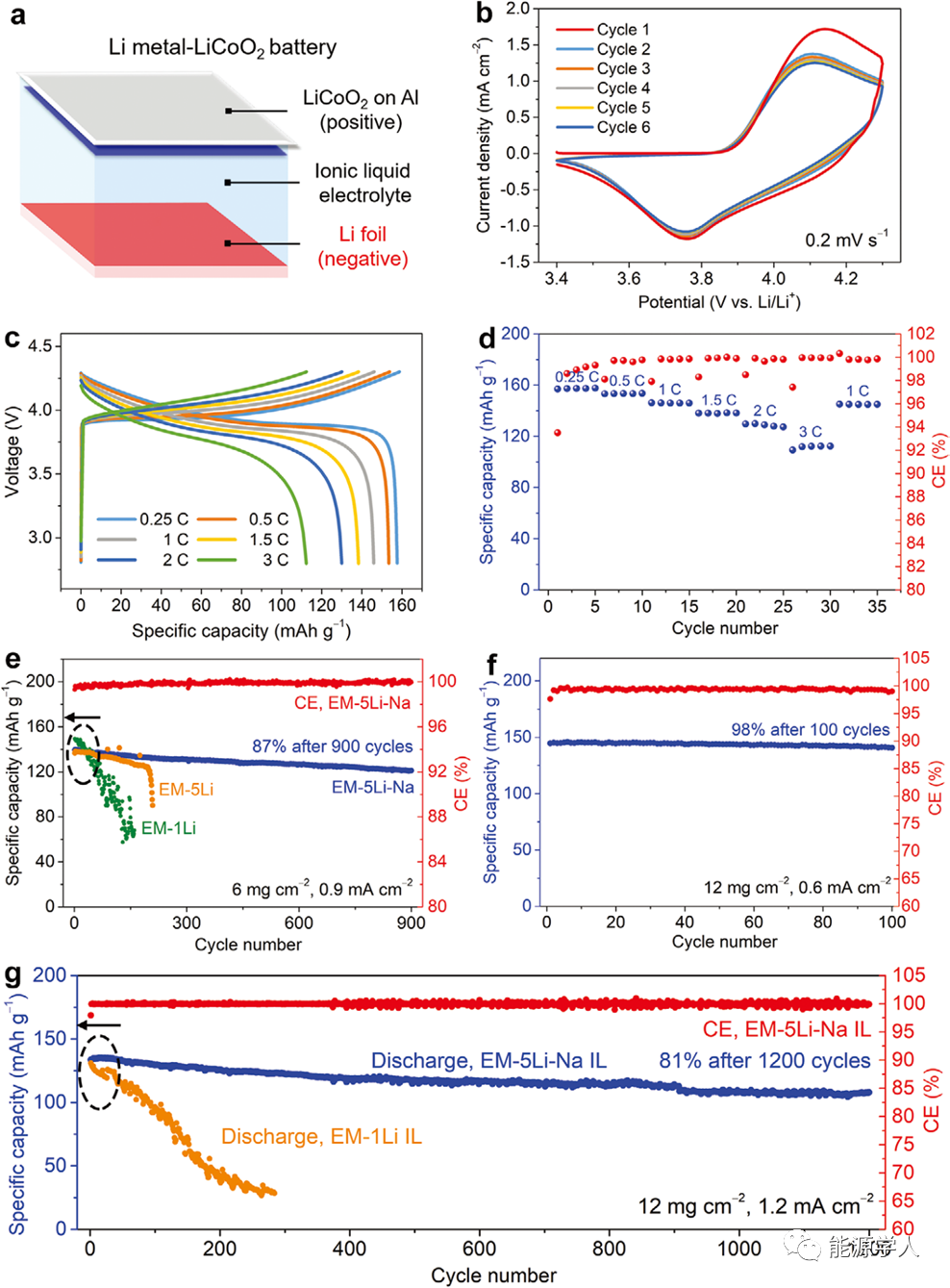 圖3 采用EM-5Li-Na - IL電解液的Li-LiCoO2電池的電化學性能。a) Li-LiCoO2電池結構示意圖。b)采用 EM-5Li-Na IL電解液的Li-LiCoO2電池的CV曲線,掃描速率為2mv s?1。c) 使用EM-5Li-Na IL電解液的Li-LiCoO2電池在不同倍率下(0.25-3 C)的恒流充放電曲線。d) 使用EM-5Li-Na IL電解液的Li-LiCoO2電池的倍率性能。(b-d)中LiCoO2的載量為≈6 mg cm?2。e) 使用EM-1Li、EM-5Li和EM-5Li-Na IL電解液的Li-LiCoO2電池在1 C下的循環穩定性曲線,LiCoO2的載量為≈6 mg cm?2。f)使用EM-5Li-Na IL電解液的Li - LiCoO2電池在0.35 C下的循環性能曲線,LiCoO2的載量為≈12 mg cm?2。g)分別采用EM-1Li和EM-5Li-NaIL電解液時Li-LiCoO2電池的循環性能曲線,LiCoO2的載量為≈12 mg cm?2,所有電池先在0.25 C下循環2次,隨后在0.7 C(≈1.2 mA cm?2) 下進行循環性能比較。