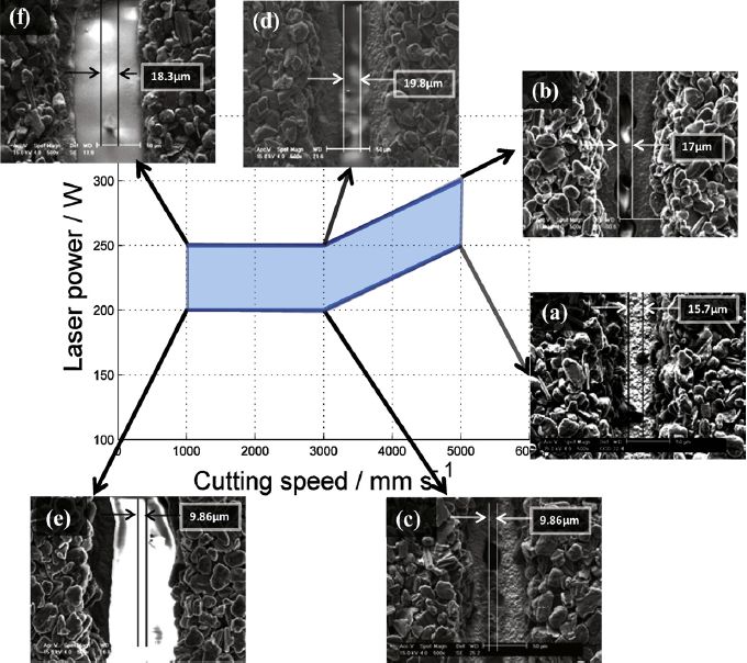 其中,激光能量和切割移動(dòng)速度是兩個(gè)主要的工藝參數(shù),對切割質(zhì)量影響巨大。圖5是不同的激光切割工藝條件下單面涂層負(fù)極極片的切邊形貌,圖6是不同的激光切割工藝條件下單面涂層正極極片的切邊形貌。當(dāng)激光功率太低或者移動(dòng)速度太快時(shí),極片不能完全切開,而當(dāng)功率太高或移動(dòng)速度太低時(shí),激光對材料作用區(qū)域變大,切縫尺寸更大。